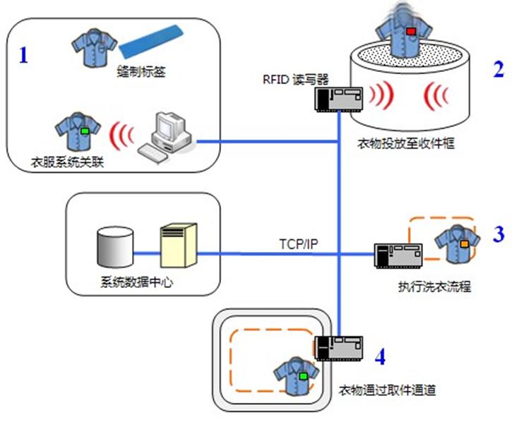 RFID智能洗衣應用系統將RFID技術(shù)應用于對衣物個(gè)體的識別與管理?;诔哳l(UHF) RFID技術(shù),開(kāi)發(fā)了一款耐水、耐熱、耐壓、耐堿性的UHF頻段RFID標簽,實(shí)現洗衣行業(yè)快速收衣、全自動(dòng)盤(pán)點(diǎn)、取衣的高效工作平臺,大大提高工作效率、降低出錯率。針對目前逐步呈現集中化、規?;?、工業(yè)化的洗衣工廠(chǎng)以及其服務(wù)對象如醫院、賓館等,可以大幅提高工業(yè)洗衣企業(yè)管理效率,降低管理過(guò)程中的錯誤率,最終達到有效管理、以管理促生產(chǎn)的目的。